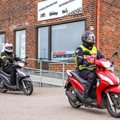 AM-körkort klass 1, max 45 km/tim. Sammanlagt 17 timmars utbildning (10 timmar teori, 7 timmar körning) - OBS! ALLA 17 TIMMAR ÄR OBLIGATORISKA! - 10 timmar teori totalt som är uppdelat i 4 tillfällen hos oss på Enslövsvägen 1 (2,5 h per tillfälle + 10 minuters paus vid varje tillfälle). - 2 timmar körning på en lördag (sker i grupp med max 4 elever med var sin moped på inhägnat område, tränar start/stop, balans, bromsning) - 5 timmar uppdelat på 2 tillfällen (där vi tränar körning i mindre samhälle, stadstrafik och landsväg) - Körkortsboken = Digital bok, onlinefrågor baserade på Trafikverkets kunskapsprov. - Mer körning om det behövs (tillkommer för 1100 kr/h) - Teoriprovet via Trafikverket (tillkommer för 420 kr)